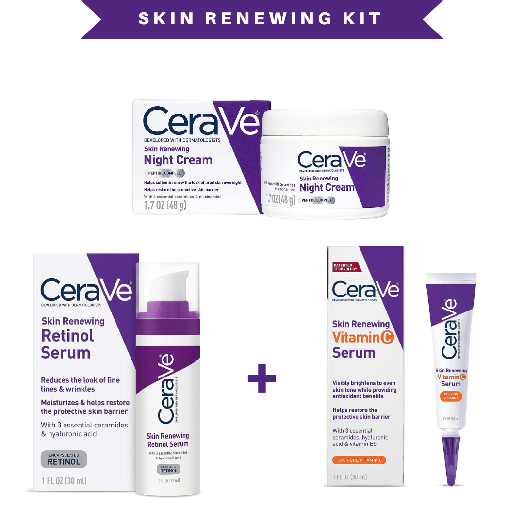 Reveal brighter, smoother skin with the Cerave Skin Renewing Kit. This comprehensive kit includes three essential products to help exfoliate, brighten, and hydrate your skin, leaving you with a radiant and renewed complexion.